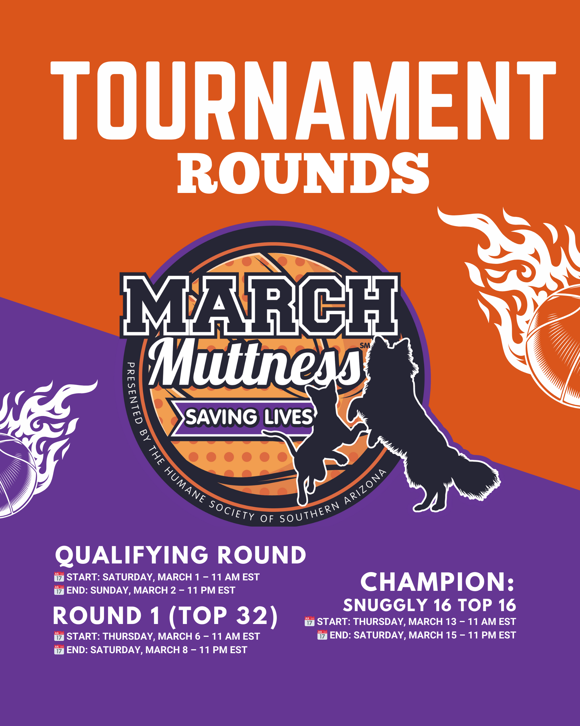 Important: Only donations made through our March Muttness campaign page during each round’s official timeframe count toward our total and determine whether we advance.