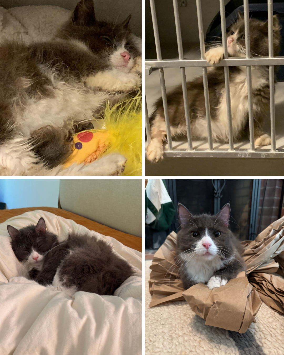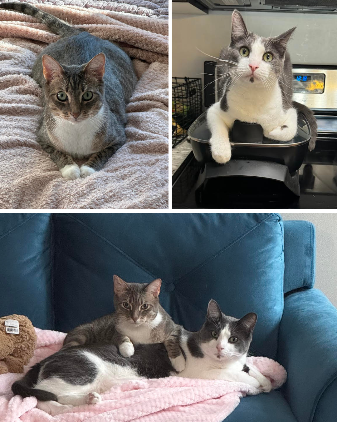 “I adopted my bonded pair, Tin Man and Scarecrow, about a year and a half ago. They just turned 2 and bring so much joy every day. When they’re not hiding my shoes or exploring cabinets, they love bird watching and snuggles. Watching them grow from shy kittens into loving, playful companions has been amazing—they even greet me at the door when I come home from work. They make every day brighter!”